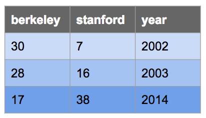 SELECT 30 AS berkeley, 7 AS stanford, 2002 AS year UNION