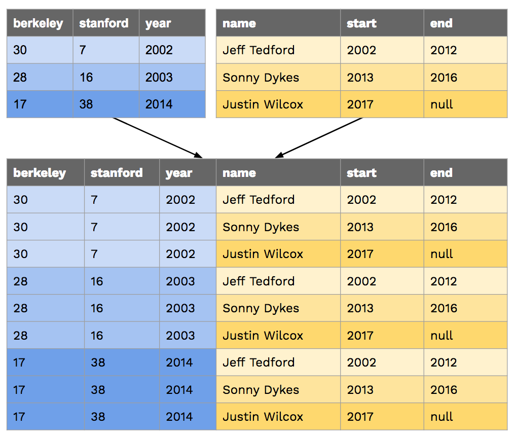 sqlite> SELECT * FROM big_game, coaches WHERE year >= start AND year <= end;